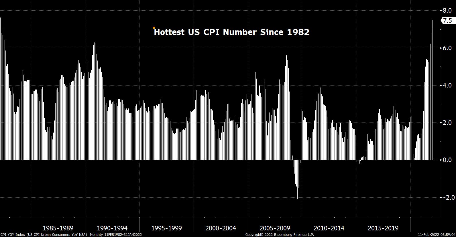 US consumer prices are accelerating at a rapid rate, 7.5% since last January, highest rate since 1982. Yesterday's CPI print is causing a lot of volatility in the markets as investor are repricing assets for different scenarios. The Feds fund futures show traders putting a 72% probability for a 50 basis point rate hike in March. Just two days ago that probability was below 30%. Interestingly, so far, we did not have any pushback from Fed members regarding market's reaction and anticipations of number of future rate hikes, something that we did witness from the ECB as French central bank governor and ECB policymaker Francois Villeroy stated markets may be overreacting following Lagarde's meeting. After the rocketing jobs report and now the hot CPI, pressure is building on the Fed to act quickly.