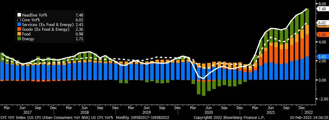 Inflation surprised once again to the upside. Prices increased 0.6% compared to last month (vs. consensus +0.4%) and 7.5% from prior year. Additionally, the December print was revised higher. Stocks were trading higher since yesterday hoping to see a moderation of inflation momentum. Alas, that didn’t happen. The S&P500 futures dropped 40 points following the print and yields are shooting higher across the curve, with the 2-year and 10-year surging 5 and 3bps, respectively. Keep in mind the FOMC minutes coming out next Wednesday will very likely have a hawkish bias to them as well.