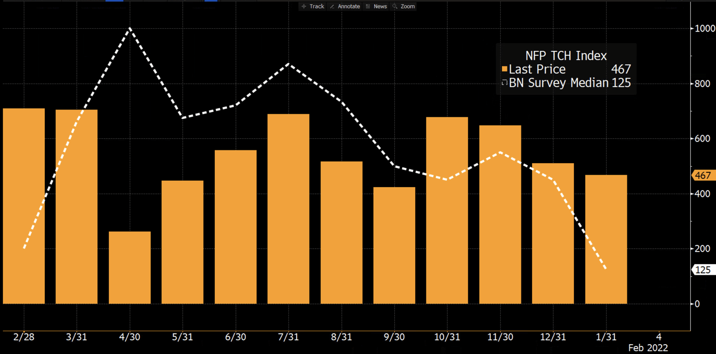 The US job creation was very strong in January, exceeding everybody's expectations. The Nonfarm Payrolls for last month came in at 467'000 nearly doubling the highest estimate in the Bloomberg economist survey. Additionally, hourly earnings growth was also upbeat at 0.7% mom (vs 0.5% expected). Recovery in jobs and higher wages pushed yields across the curve higher, as this increases the odds of a hawkish response from the Fed in March. The dollar gauge (DXY) also spiked on the back of rising yield and caused gold and other commodities prices to dip.