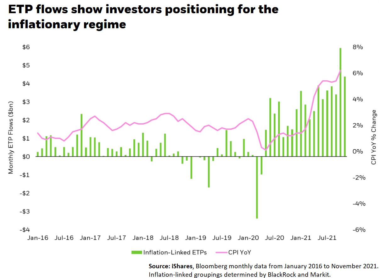 Investors have poured capital into investments tied to the inflation theme this year. It's not a surprise to anyone that investors are positioning to hedge against the threat of inflation. Investors have allocated an impressive 20% of the $180 billions of inflows into ETFs in 2021 towards inflation-protected funds, according to iShares. Additionally, flows towards real assets such as real-estate, infrastructure, or commodities have also been very strong. Inflation will most likely remain a key topic on top of investors' agenda entering next year. A more pronounced level of inflation or a less persistent one could see investors rapidly rebalance portfolios. Nonetheless, there could be other reasons investors added to alternatives such as for diversification purposes amid surging stock prices.