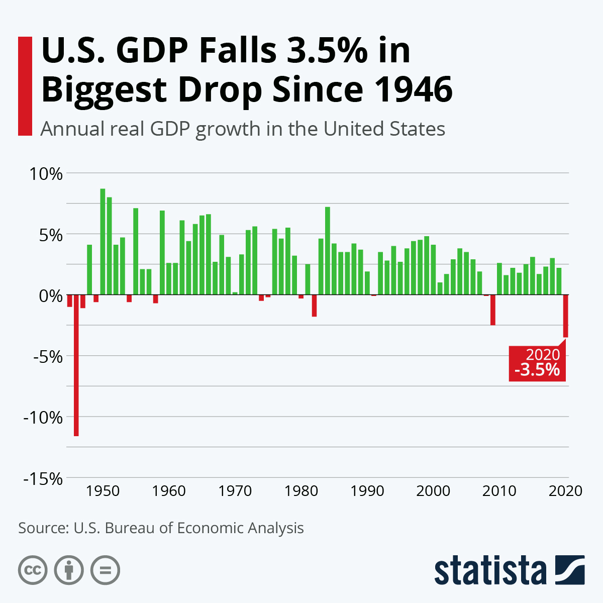 The real GDP increased at an annual rate of 4% in the fourth quarter, down from 33.4% in the third quarter. For the full year, it saw an overall decline of 3.5%, a down movement never seen since 1946. The main cause was the decrease of personal expenditures - such as services - and exports.