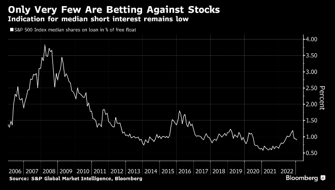 The median short interest for members of the S&P500 suggests that not many market participants are betting against the current rally. Shares out on loan stands just <1% of the benchmark’s median free float as of Jan. 31, according to S&P Global Market Intelligence.