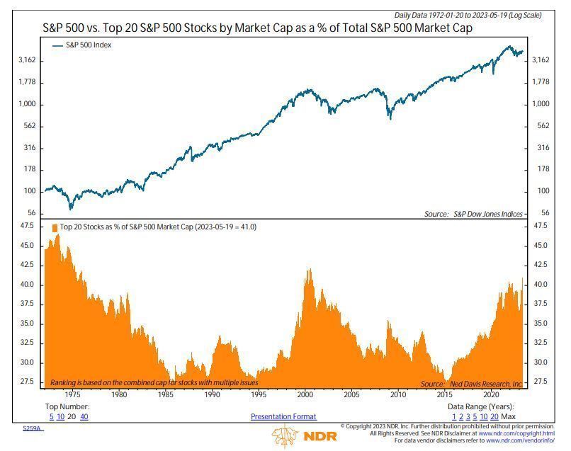 Largest 20 S&P 500 stocks up to 41% of the index's market cap. The most since 2000, according to NDR Research. This means there are greater chances that if a few of these stocks disappoint or outperform, the market could see strong swings in either direction. This is also a warning sign as the index gets more concentrated. Yet the capital-weighted index has largely outperformed the equal-weight as Big Tech stocks surged since the start of the year.