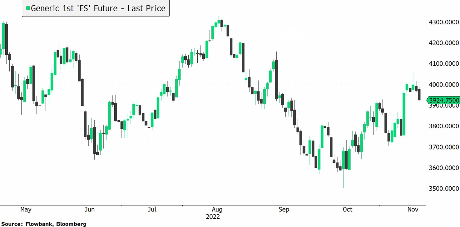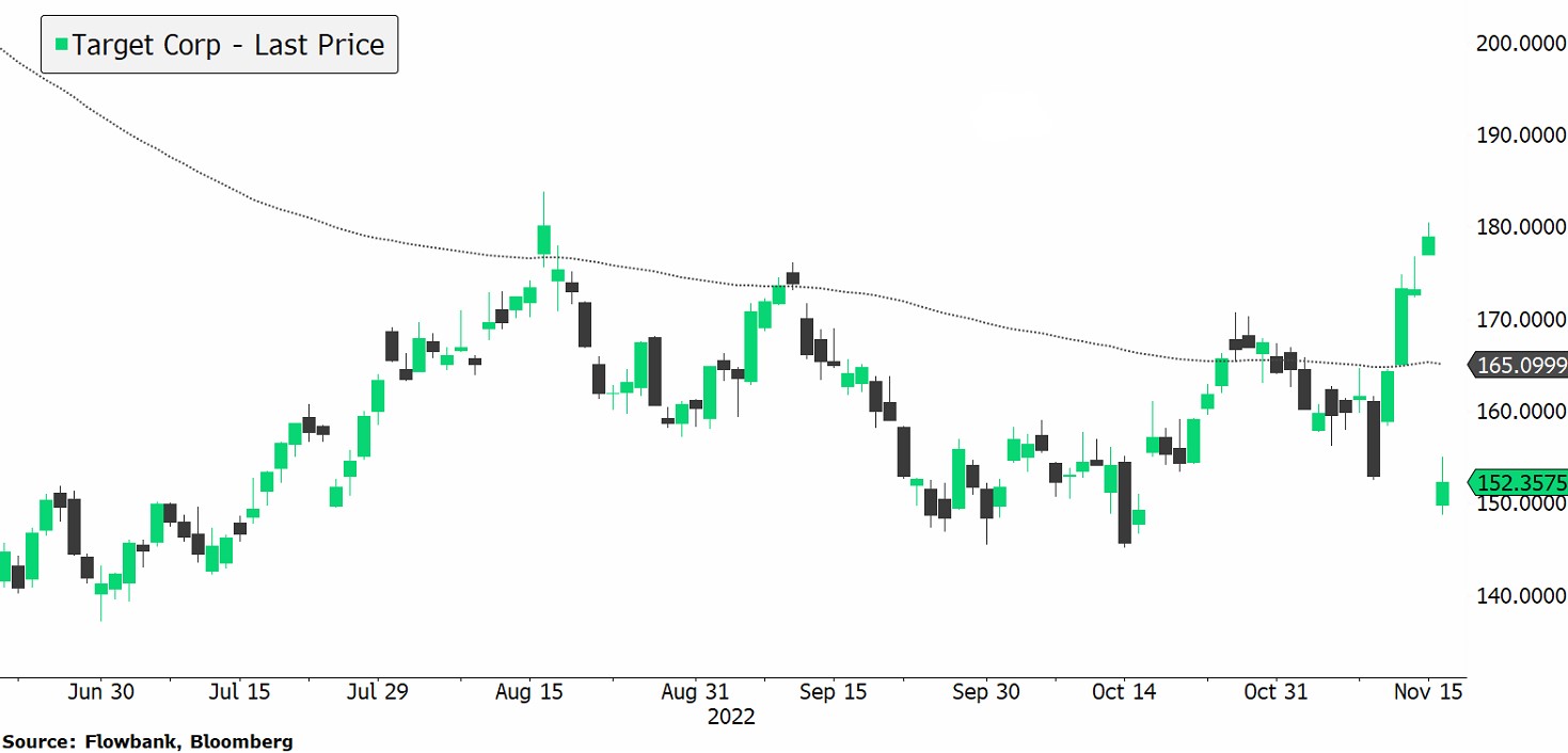 The S&P500 could see higher volatility upon the release of the November FOMC meeting minutes on Wednesday, which should offer insights into how the Fed is thinking about the path of rate increases. Tech companies HP and Dell (today in after-hours) will report earnings, offering a glimpse of the state of demand for PCs. And retailers Best Buy and Dollar Tree will report earnings, ahead of "Black Friday", which is historically one of the year's biggest shopping days. This morning S&P500 futures are lower as the number of China Covid cases jumped over the weekend, worrying traders about the global growth outlook.