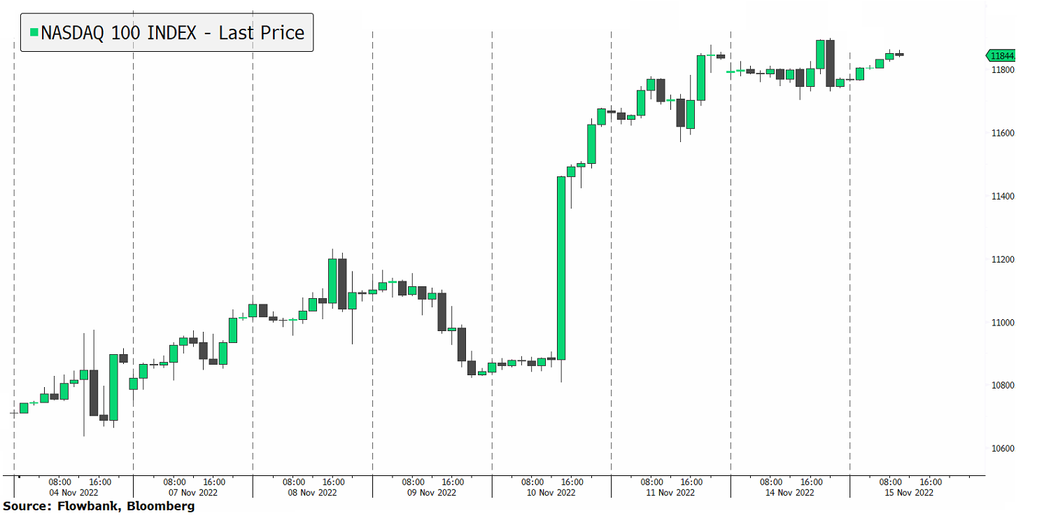 The Nasdaq 100 is pushing 1% higher in pre-market as markets are encouraged by signs of China easing its restrictions and helping its struggling property sector. Traders are also constructive on markets ahead of PPI being released before market open. It is expected to increase by 0.4% month-over-month for October, the same as last month. Both Walmart and Home Depot are scheduled to release earnings in pre-market. Investors will look for clues on the state of consumer spending and how are the big box retailers' margins holding up amid inflation.