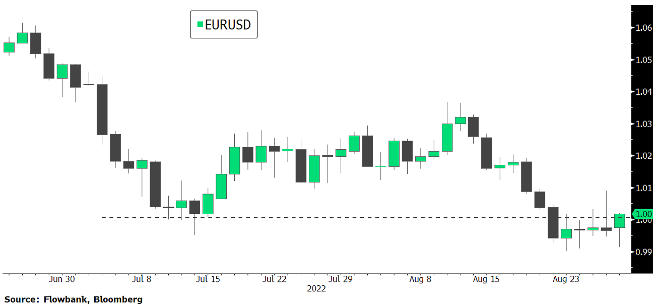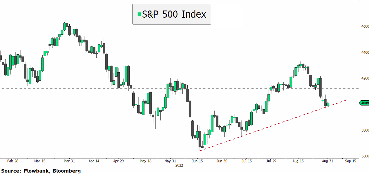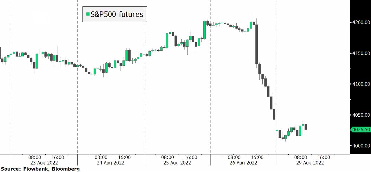 S&P 500 futures are up 0.5% after the selloff triggered by the Federal Reserve Chair Powell's strong words on more financial conditions tightening needed to bring down inflation. Traders are still in fear that the Fed's quantitative tightening and a spike in the dollar could trigger a recession. From a technical perspective, we are around a 50% retracement of the rally from the June lows. The S&P 500 could find some support around current levels or slightly below.