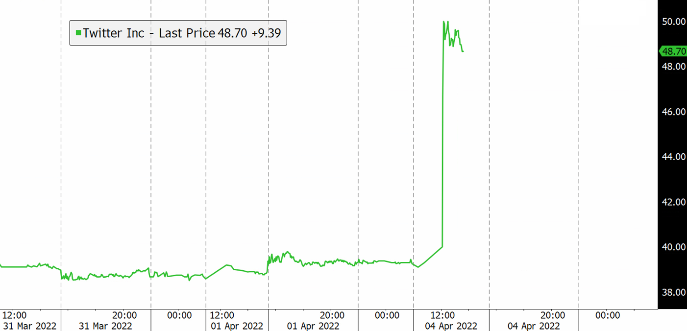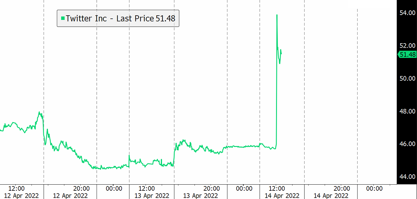 Elon Musk has offered to buy 100% of Twitter for USD54.20 per share in cash. He says he believes that Twitter should be private to go through the changes that need to be made. The Tesla CEO says his offer is final and if not accepted he would need to reconsider his position as a shareholder. Tesla shares were lower by 1.6% in pre-market as traders view Elon's involvement in Twitter as a distraction from focusing on Tesla. Twitter shares are up 11% to USD50.9 in pre-market.
