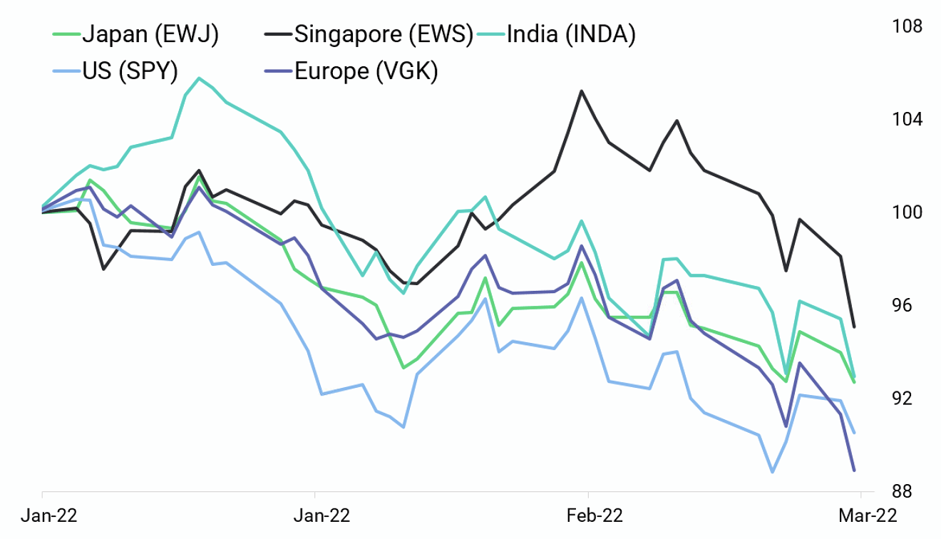 Asian equities could outperform their US and in particular European peers as they face fewer geopolitical risks. The region looks relatively less vulnerable and offers attractive valuations. For instance, Japan's forward PE ratio stands at 13.4, much lower than the levels seen for the US (20.2) or EU (14.4). Conversely, stocks in Europe are the most at risk because of their proximity to the war. In the US, not only does the war add upside risk to inflation, and it also raises the odds of a bumpier growth. Central bank policy is another reason to favor the region. While the BOJ and the PBOC are sticking to easy monetary policies, the Fed is probably getting ready to hike interest rates in March, and the ECB members are debating how to end their stimulus program. As such, Asia may offer a haven from the greatest risks.
