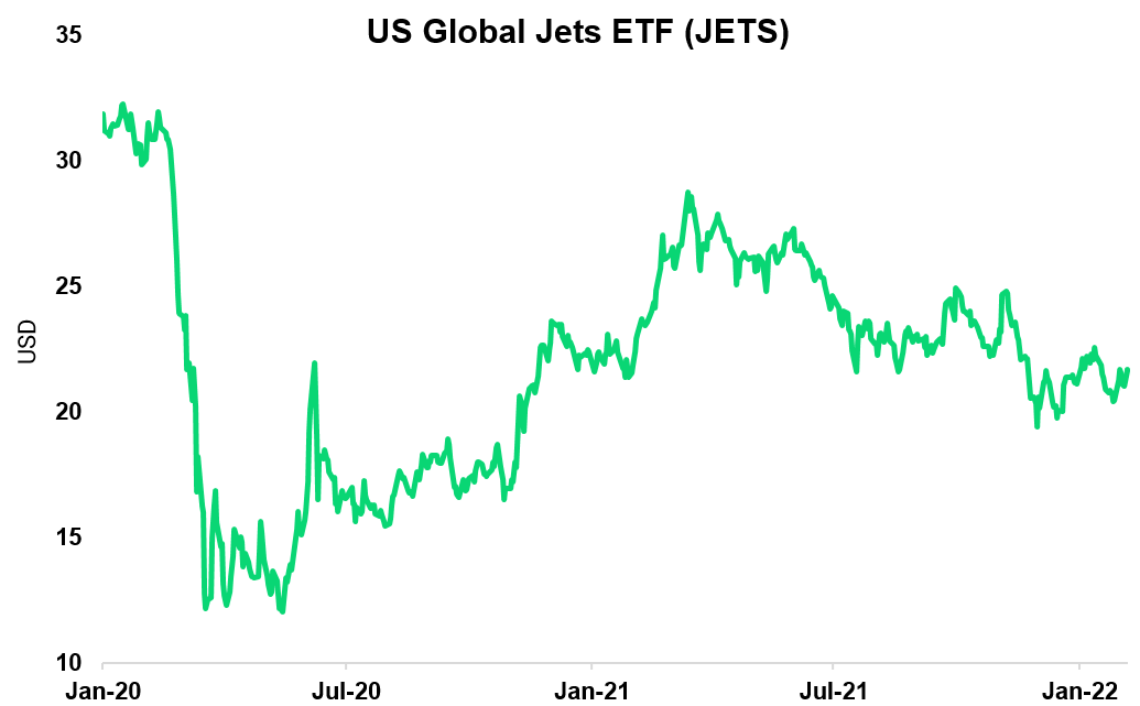 US budget airlines Frontier Airlines and Spirit Airlines will merge to create the US' 5th largest carrier by market share. Spirit Airlines (SAVE) gained 17%, and the US Global Jets ETF (JETS) gained 2.8% yesterday, now just -0.8% ytd. Traders are eyeing airlines as a key recovery play in a post-pandemic world. The JETS ETF still stands 23% lower than its highs of $28 in March 2021. Similarly, stocks of large US cruises including RCL and CCL are making a strong recovery, well ahead of the recovery in their underlying businesses.