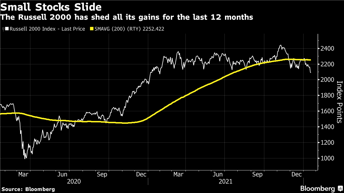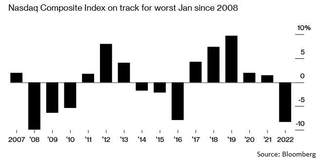 Volatility has skyrocketed from about 17 to 38 currently, a level last seen in January 2021. Risk assets have sold off from stocks to crypto, all styles included, at a rapid pace, accelerating in the last few days, making it difficult for traders taken on the wrong side of the trade to readjust positions quickly enough. At the heart of the market anxiety, investors are fearing a Fed tightening and disappointing earnings could cause more selling. However, earnings are resilient so far, and the market has discounted a lot of the Fed tightening well ahead before it has even began. With the Fed on Wednesday and several earnings release this week, the market may find some support, in what remains an extremely volatile environment rarely seen during the post-Covid era.