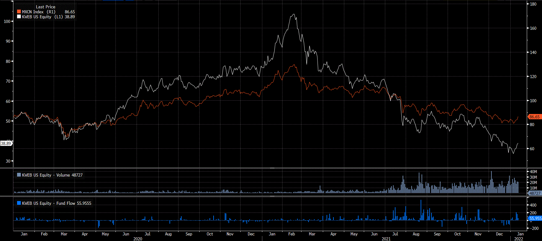 It is not a surprise that Chinese tech stocks have suffered in the past year as the government launched a wave of regulation for big-tech, targeting industries from fintech to video games to online tutoring. With valuations down significantly, it appears investors are starting to take notice. The KraneShares CSI China Internet ETF, that tracks the largest names of the China internet theme, has seen inflows pick up recently. The group overall has started finding buyers after the steep sell-off. Risk-averse investors should beware however, as stocks in the region have shown to be very volatile and a move in either direction can be swift.