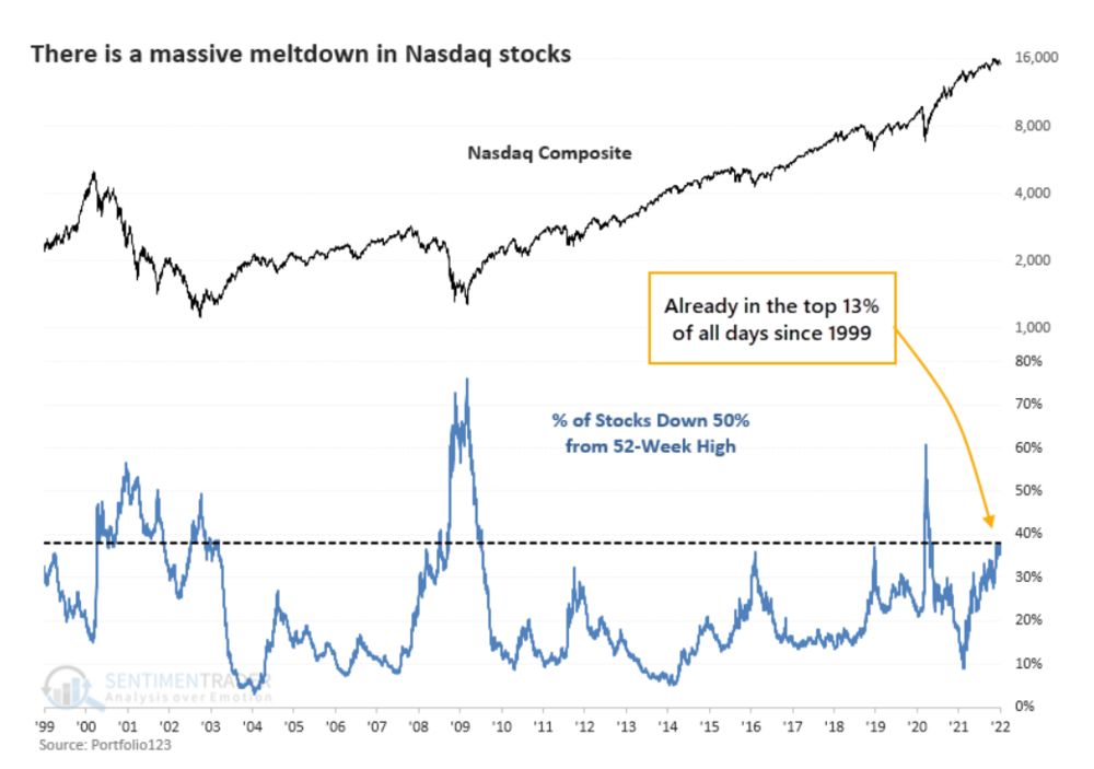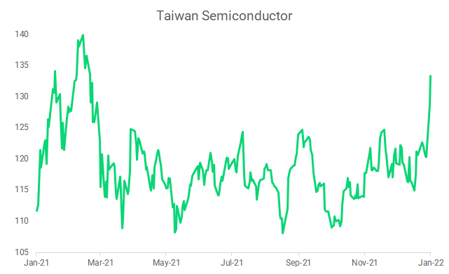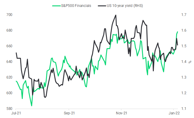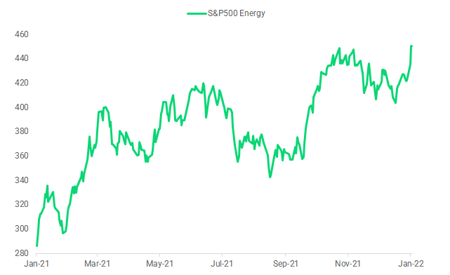 After multi-year stellar performance, the Nasdaq 100 is displaying significant signs of weakness in early 2022. After failing to make new high, the index reversed gains and now stands at an important support level of USD15'500. The index could be due for a bounce after reaching oversold levels. The Nasdaq has been able to hold well thanks to the higher weighting of the FANGs stocks, which are only down in the mid single digits. However, further weakness from these mega caps could cause the index to break its upward trendline. Additionally, more than 40% of the Nasdaq components are down 50% or more from their highs, a level not seen since March 2020. Performance of the S&P 500, the Nasdaq, and the Dow Jones are +0.17%, +1.59%, and -3.05% respectively since the December FOMC meeting.