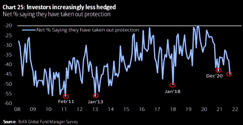 Investors are however increasingly less hedged with the net percentage of investors saying they have taken out protection falling below December 2020 levels. @themarketear