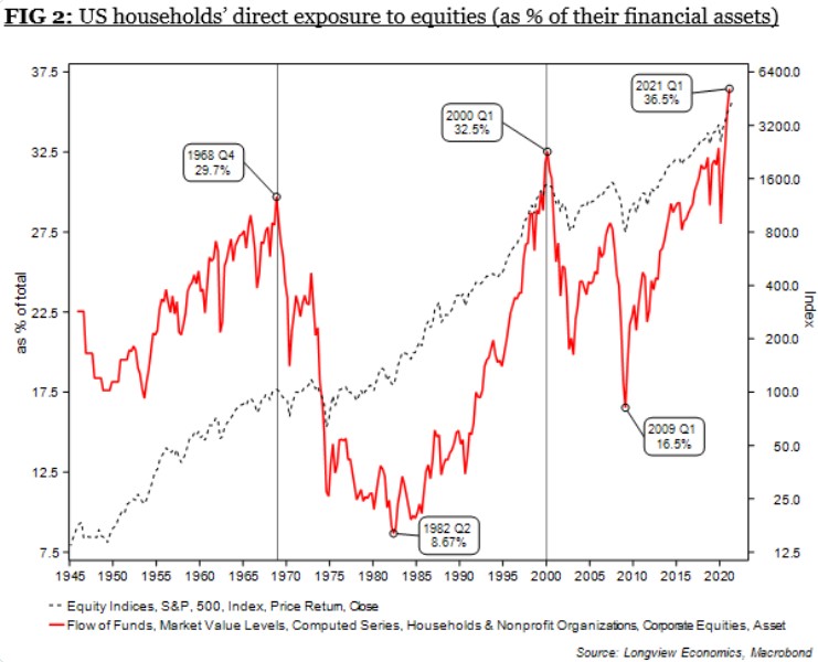 One of the scariest charts around right now is the US household equity exposure. We are firmly above the 2000 peak and at a 70-year high (i.e. since records began). What happens when the 'everything bubble' comes to an end? @Longview Economics