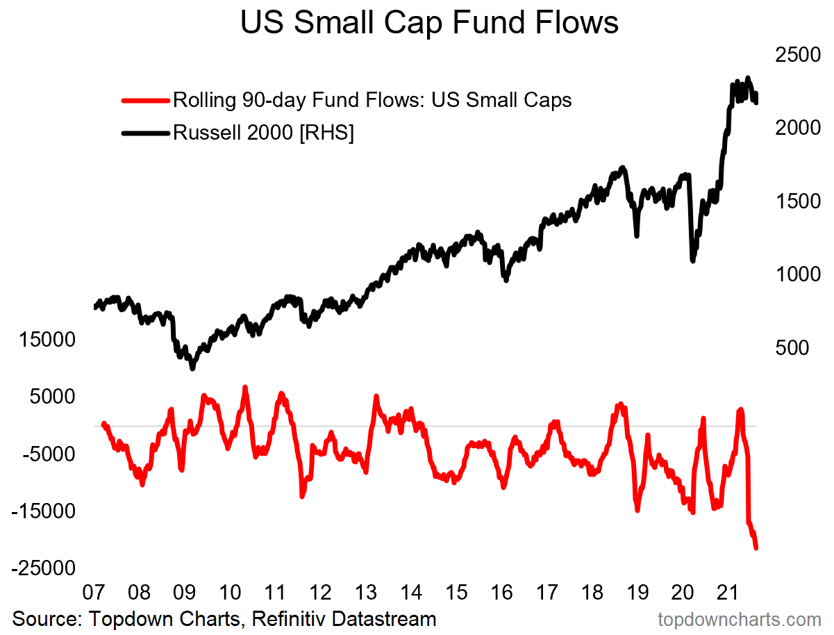 Outflows from small cap funds hit a recent record according to this data, yet the index has stayed flattish within the range. Seems very bullish if people start to allocate at least a small bit of funds to small caps again and some buying resumes. Source: Topdown Charts