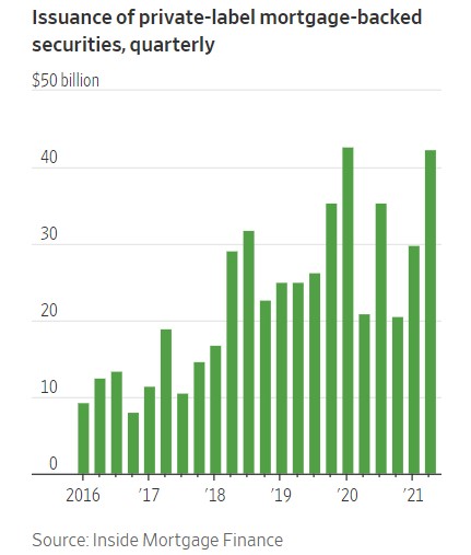 The so-called private-label mortgage market—in which financial firms serve the middleman role of creating giant pools of loans and selling them to investors—had more than $42 billion of issuance in the second quarter. That is the most since the pandemic started and almost the most for any quarter since the last financial crisis, according to Inside Mortgage Finance, an industry research firm. Source: WSJ