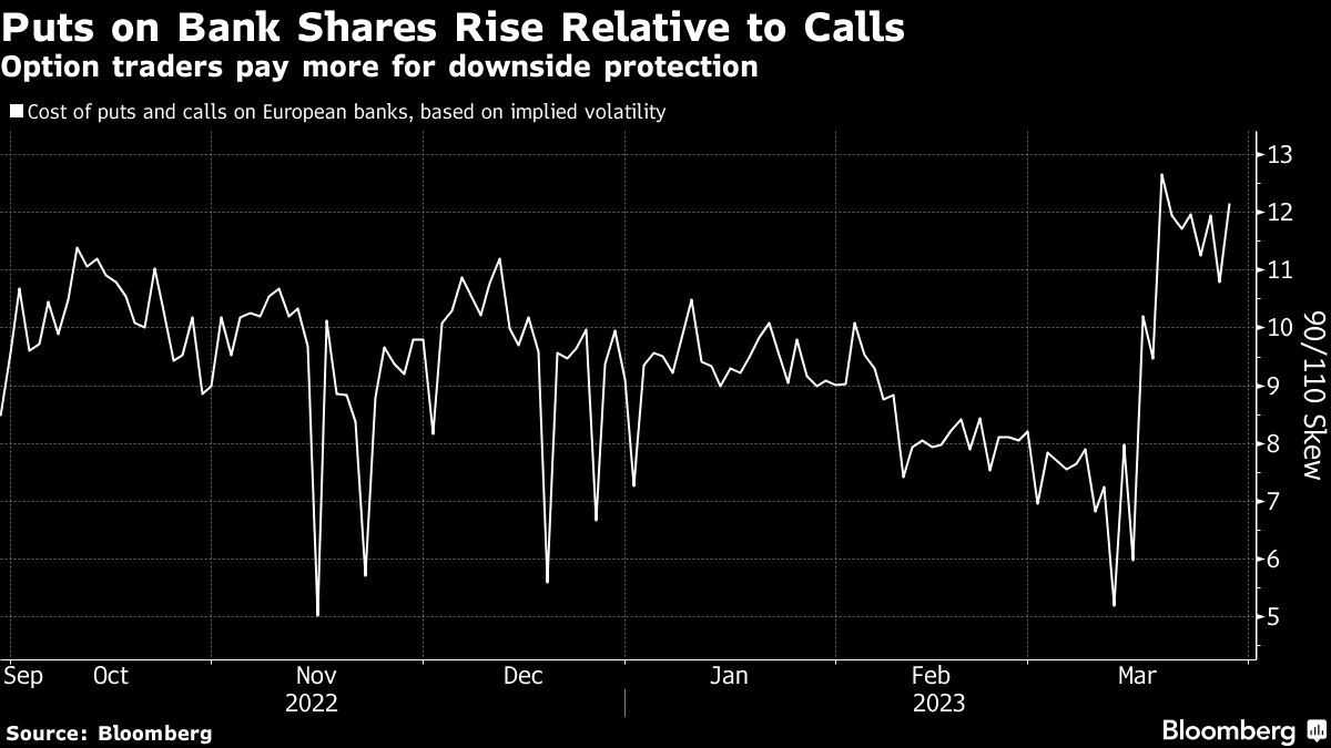 Risk aversion for European bank shares continues. The cost of insuring against downside for banking stocks remains elevated, per Bloomberg.