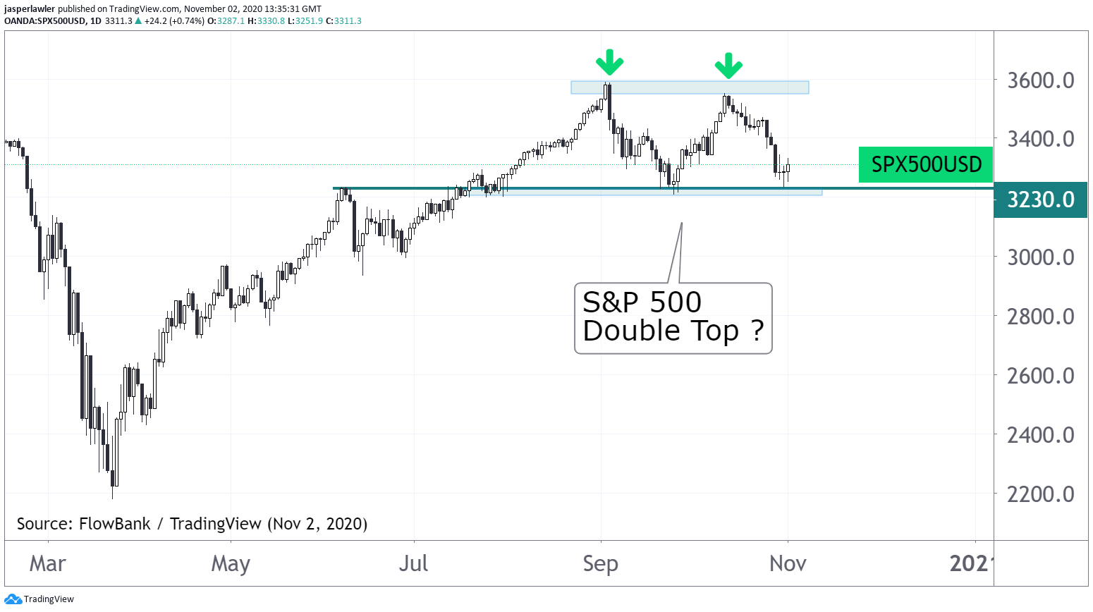 The S&P 500 index has failed twice at 3500, setting up a double top price pattern, which would be confirmed with a break below the neckline at 3200.