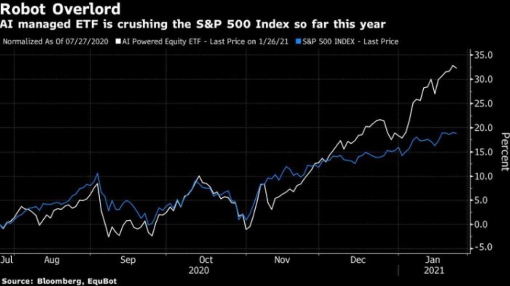 AIEQ, the robot ETF developed by EquBot assesses more than 6,000 US stocks everyday. It scrapes regulatory filings, news stories, management profiles, sentiment gauges and more. It then picks between 30 and 70 companies on a $130 million budget. Between October 2017 and today, the fund has seen a 75% return compared to the S&P500's 60%. Source: Bloomberg