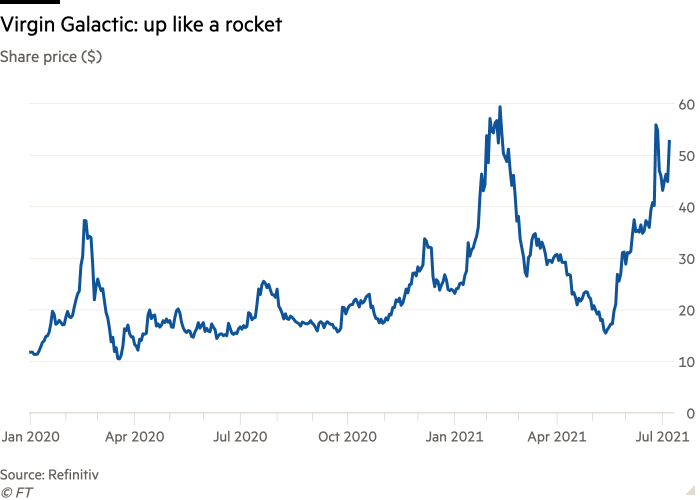 Virgin Galactic's founder, Richard Branson, is travelling to space this weekend. This flight represents a great marketing campaign as it launches the company's space tourism business. In the past, Virgin's share price was strongly correlated with events such as delays in its test schedule. We'll have to wait in order to know how the share price is going to react if the flight is successful.