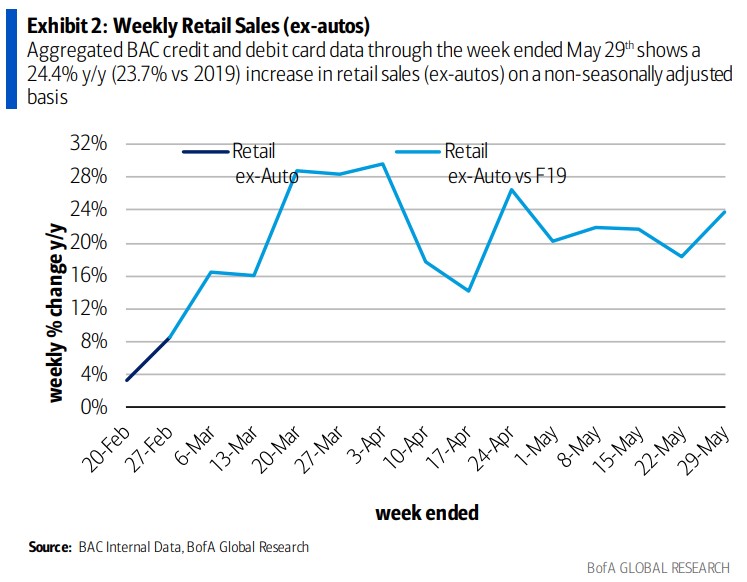 Clothing traffic and brick and mortar sales have been on the rise, says credit card data from Bank of America. The week ended May 29th shows a 24.4% YoY increase in retail sales (excluding cars). E-commerce sales have actually slowed down a bit but are still up 1.3% YoY, which volume is still bulky considering an impressive 2020 e-commerce year.