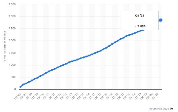 With roughly 2.85 billion monthly active users as of the first quarter of 2021, Facebook is the biggest social network worldwide. In the third quarter of 2012, the number of active Facebook users surpassed one billion, making it the first social network ever to do so. Active users are those who have logged into Facebook during the past 30 days. During the first quarter of 2021, the company stated that 3.45 billion people were using at least one of the company's core products (Facebook, WhatsApp, Instagram, or Messenger) each month.
