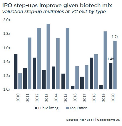 "Valuation step-ups at exit also had a robust year, with public listing step-ups improving YoY to 1.4x, while the acquisition step-up held at 1.7x—approximately the 10-year average. The strength in 2020's public equity multiples buoyed these step-ups, especially on the public listing front and specifically in relation to growth businesses."