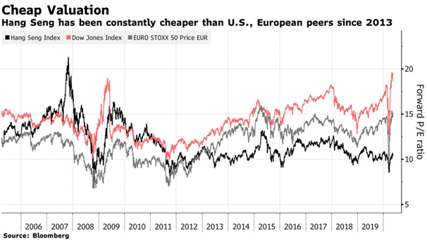 Social tensions continue to be an issue for Hong Kong, which faces an existential crisis in its international identity. The opportunity is if a lot of these ‘social’ concerns seem are already priced in. The Hang Seng Index is trading at 10x forward price/earnings, which is close to its historical low (see chart below). Meanwhile, the social tension has recently shown some signs of abating, although visibility remains low. The Hong Kong stock market is comprised of roughly 70% offshore Chinese companies and 30% domestic Hong Kong companies. While the former should benefit from a more favorable macro policy backdrop in China, the domestic Hong Kong companies are facing the headwind of an economic recession in the city. For it to prosper once again, Hong Kong needs to show it can benefit in different ways from its closer allegiance to China, perhaps I part via more big Chinese company listings.