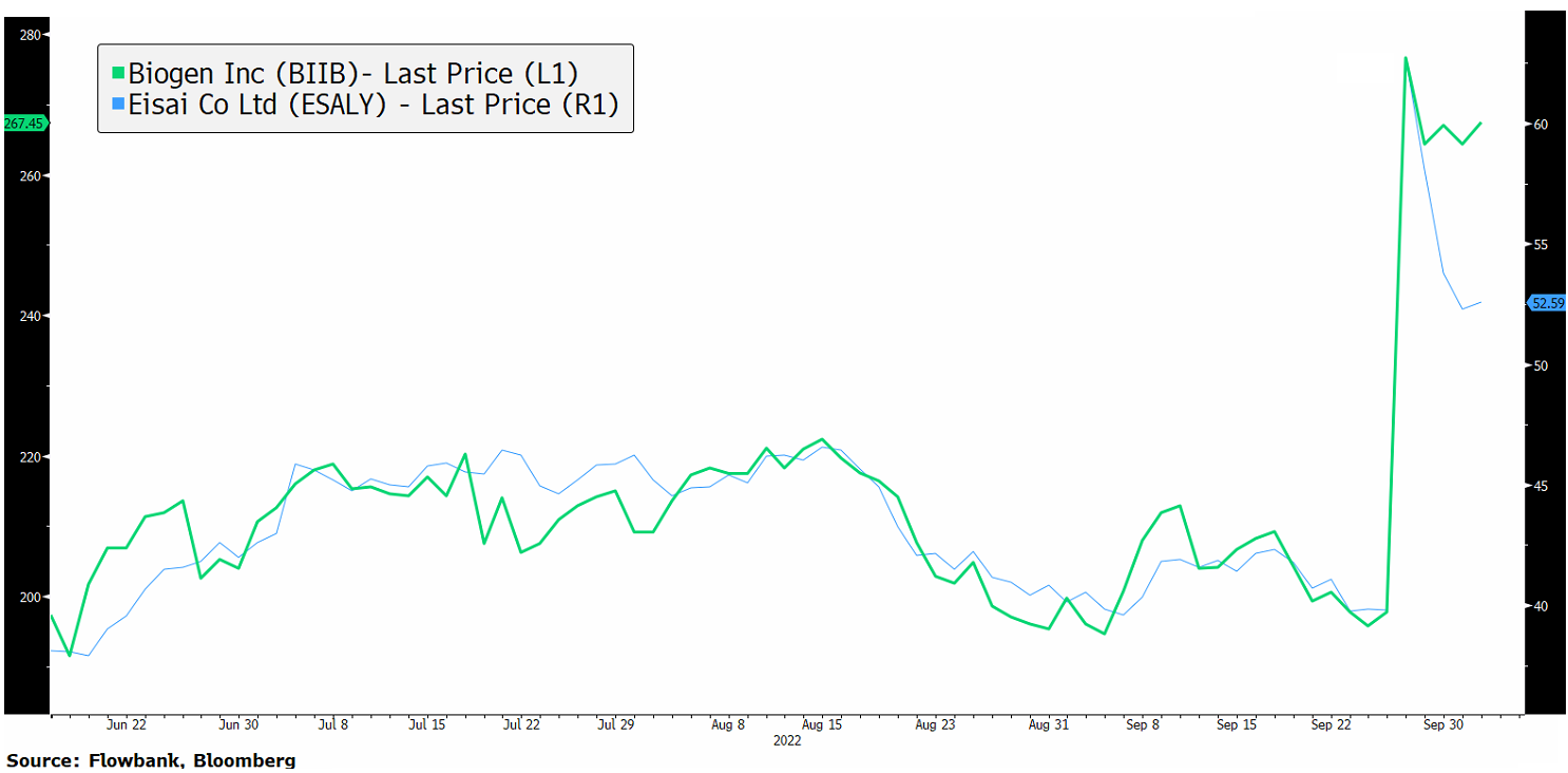 It is also important to point out that the Biogen-Eisai duo is already leading in the race to help Alzheimer patients. It has already developed the first FDA-approved therapy for Alzheimer’s disease, called Aducanumab, and sold under the brand name Aduhelm, launched in June 2021. While the Aducanumab treatment is promising, the high price tag of roughly USD56’000 for the average patient has limited its success given Aduhelm has not convinced all doctors to prescribe it and the drug does not qualify as reimbursable by government-funded health schemes. Investors are hopeful the stronger discovery Lecanemab will obtain the title of being reimbursable, which would make it much more likely for the treatment to achieve massive sales.