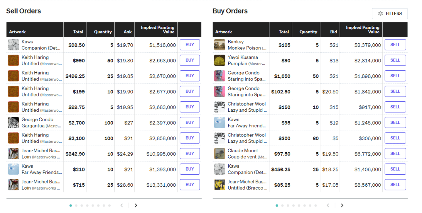 And lately, one stand out company has come out on top of all others to create the closest thing to a blue-chip artwork stock market, Masterworks.io. The image below shows you what their US based secondary market looks like. They appear to offer retail investors shares of famous artwork at a fraction of the work’s price. Yes, you can now trade art like you do shares of Tesla.