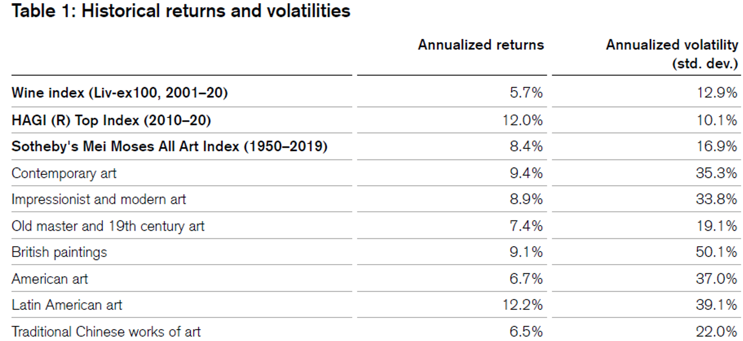 Why are we even talking about this? Because there are some juicy returns tied up to Art, seen in the following display that we extracted from Deloitte’s latest report on Art Investing. The annualized standard deviation you see on the right column is equivalent to risk, or the rate of change in the asset going up or down. Volatility is also a good signal for trading, with the volume follows that is. In other words, you would prefer a liquid market to trade in because then you have more liberty around the timing of your exits.