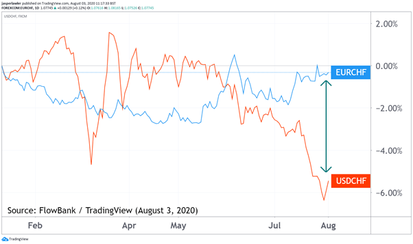 Chart: EUR/CHF vs. USD/CHF (year-to-date)