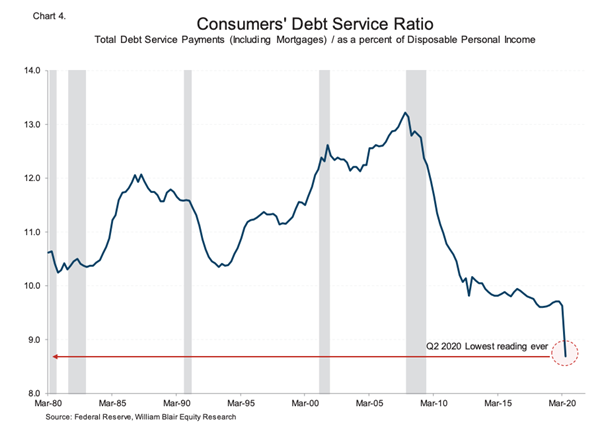 What has been unique to this crisis is that governments adding to national debt has coincided with the cost of servicing those debts fall, largely because of investor demand for yield and because of central bank bond purchases. The same can be said at the consumer level, where the consumer’s debt service ratio has fallen to an all-time low.