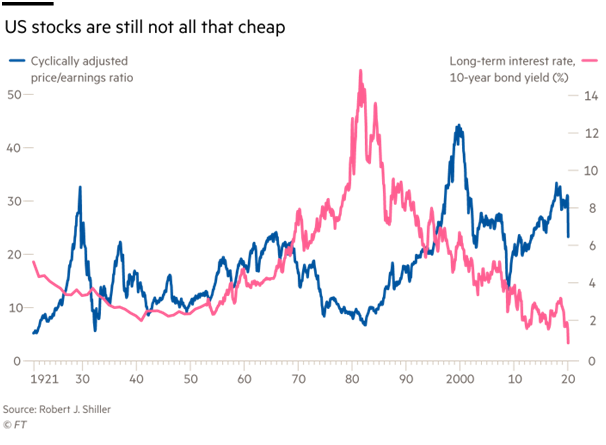 Stock market valuations have a very different starting point in 2020 to 1920. The cyclically adjusted P/E was around 6x, not over 30x.
