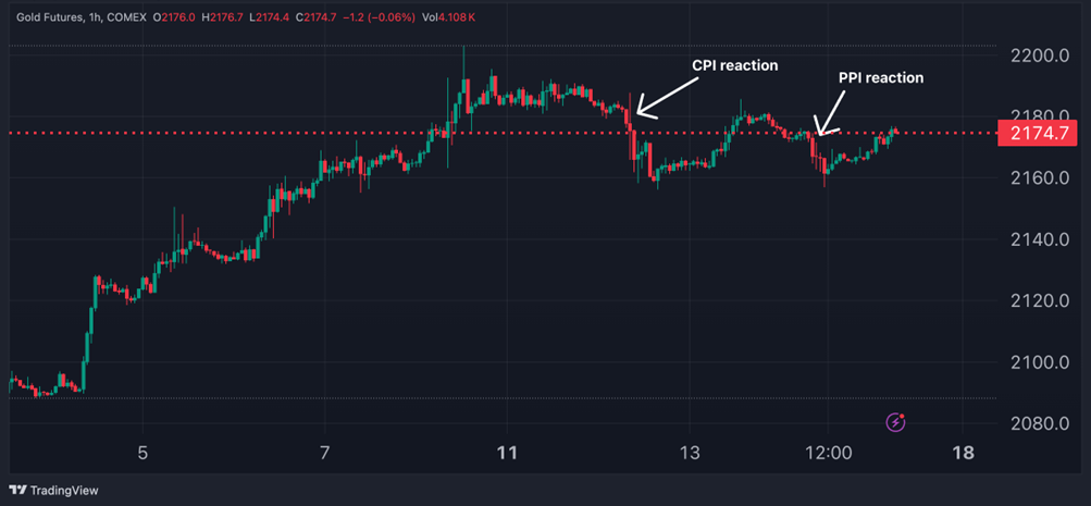 Gold prices declined by 1.1% on Tuesday following the CPI report and by 0.6% on Thursday after the PPI report.