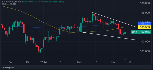 The greenback is targeting the 50-day moving average at 103.54, followed by the 200-day average at 103.69, which aligns with a declining wedge pattern that began last month.