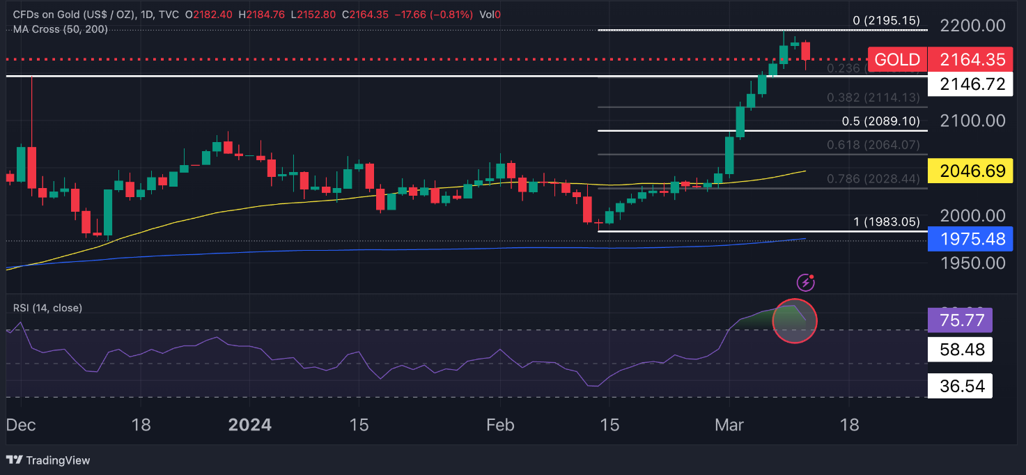 If the Fed opts for a hawkish stance by signaling fewer rate cuts for this year and 2025, gold could potentially retrace nearly half of the February-March rally, potentially dipping below $2,100/oz.