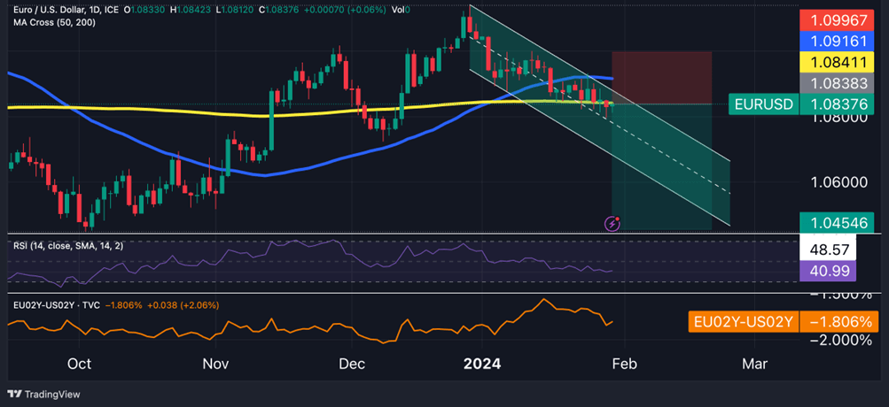 Short-term interest rate differentials between Europe and the United States could further decline into negative territory if the Fed opposes the market's optimistic expectations of rate cuts in 2024. Currently, the 2-year yield spread stands at -180 basis points, but hawkish remarks from Fed Chair Powell could widen this gap to -200 basis points. If this outcome occurs, it’s likely to exert downward pressure on the EUR/USD pair.