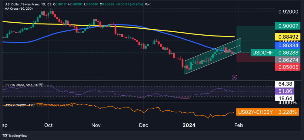 The USD/CHF pair has experienced a bullish resurgence in January, driven by widening 2-year yield differentials between the U.S. and Switzerland. Beyond the possibility of the Fed pushing back against market expectations of rate cuts, which is likely to bolster the dollar, there are indications that the prolonged trend of the Swiss Franc's appreciation may be nearing its end. During the Davos Summit earlier this month, SNB President Thomas Jordan expressed caution, hinting that the central bank might reconsider its current policy in response to the sharp rise of the Swiss Franc.
