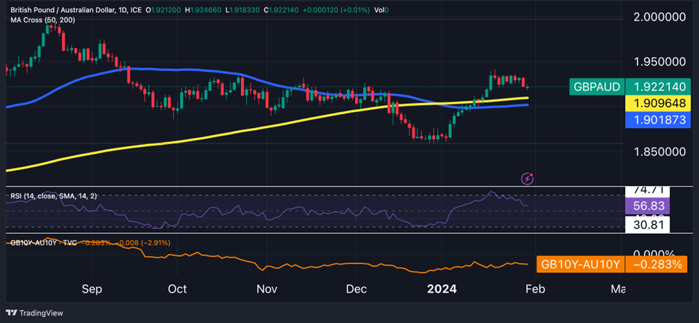EUR/USD has been following a descending channel pattern since late December, breaking below the 50 and 200-day moving averages. The short-term setup remains bearish, confirmed by an RSI consistently below 50 since mid-January. The projected downward trend could target 1.0450 by the end of February. Breaking above the 1.0995 level (January 11th’s high) would serve as a potential stop placement point for bearish strategies.