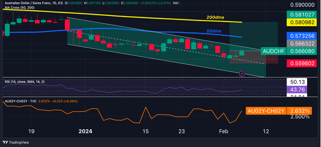 From a technical perspective, AUD/CHF has yet to provide a clear bullish signal, as it remains firmly within a descending channel pattern that has been in place since late December. However, there are some early bullish signs, with the RSI showing a slight uptick, and a potential retest of the channel's resistance line approaching. A key bullish signal to watch for would be a break above the 0.5740-0.5750 zone, which aligns with the February highs and the 50-day moving average. As for an aggressive strategy, targeting the 200-day moving average at 0.5810 could be considered, with a stop placed below 0.66.