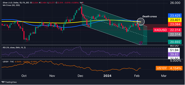 Silver appears to be in a vulnerable position as Treasury yields rise and the U.S. dollar strengthens. The U.S. 10-year Treasury yield is currently at 4.15%, testing levels not seen since December 12th. If further increases in yields occur, with the 10-year rate reaching levels between 4.40% to 4.50%, silver is likely to face more downward pressure, potentially falling to the lows seen in November.