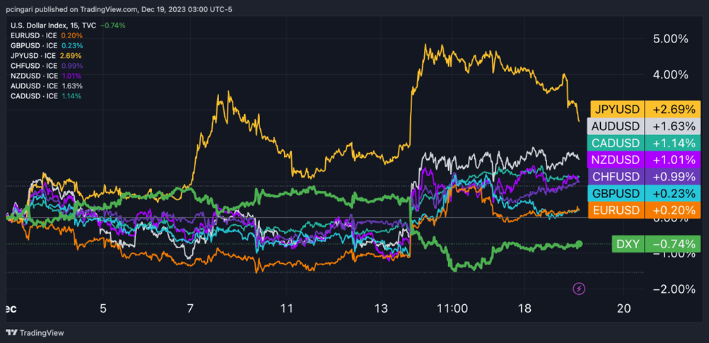 In its final meeting of 2023, the Bank of Japan left markets disappointed by not providing any clear signals of a potential shift in its ultra-expansive monetary policy for 2024, despite prior expectations. The BoJ maintained its short-term rate at -0.1% and the target for 10-year government bond yields around 0%, with a 1% upper threshold. As a result, the yen experienced a 1% decline on Tuesday. Nevertheless, it's worth noting that the yen has still been the strongest currency for the month so far.