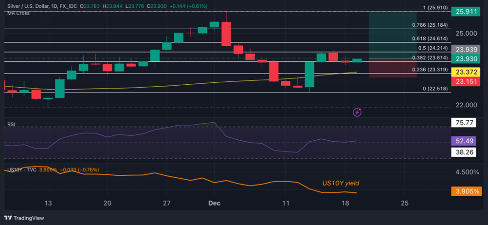 Silver Technical analysis: Following the Federal Reserve meeting on December 13th, XAG/USD experienced a robust 4.7% rally, marking its best single-day performance since mid-March. The precious metal has also climbed back above the 50-day moving average, potentially paving the way for further price increases in the coming weeks. Silver has retraced nearly half of the previous bearish wave that occurred between December 4th and 13th. Bullish traders may set their sights on a full retracement rally to $25.91. However, it's worth noting that a drop below $23.15 would be of technical significance, as it would breach both the 50-day moving average and the 23.6% Fibonacci retracement level.