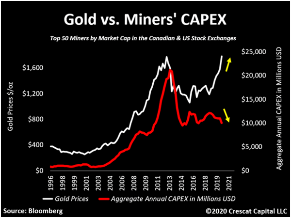 Gold miners seem to have collectively learned hard lessons from the previous boom and bust cycles in the gold price. Miners would typically load up with new mining investments when the price of gold gained to take full advantage of the higher profit potential. However, when the gold price turned south, they would be left over indebted with lower returns in which to pay it off. So this time around, gold miners have been very conservative. However, should the price of gold continue to rise, it would be remiss of management not to try to expand output through new capital spending to some degree.