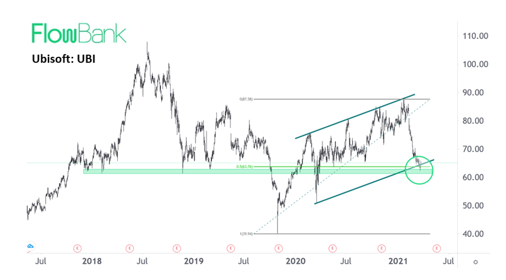 Ubisoft is a leading French video game company with a market capitalization north of $8 billion. You might know it from game like Assassin’s Creed, Prince of Persia, or Just Dance. The stock is reaching its 52-week low of $61.20 and is exhibiting some intriguing patterns as illustrated in the chart below.