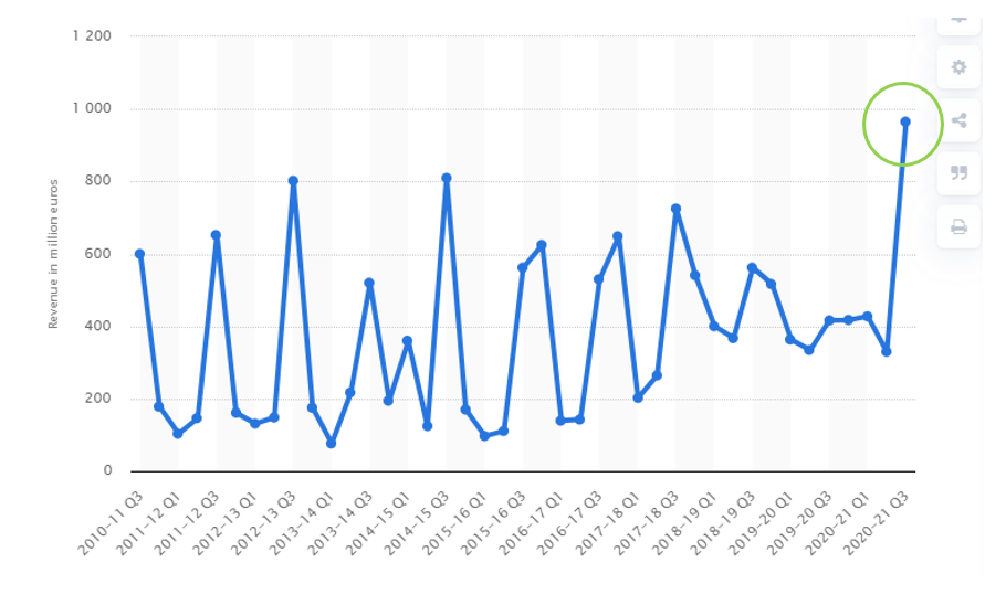 Figure 3: Ubisoft breaking past its previous $800 million quarterly high