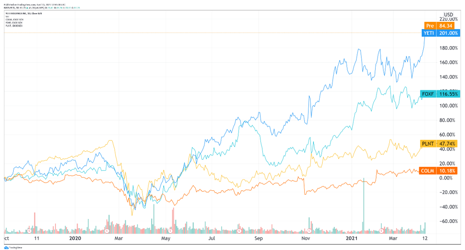 As of this writing, the share price is floating around its all-time high but do not despair. Peers Fox Factory Holdings, Planet Fitness and Columbia Sportswear, companies that share similar market caps of $7 billion and produce goods in the outdoors business somewhat comparable in value to Yeti, have all seen share price surges so far but none as large as Yeti’s. It is possible that Yeti could see some correction from this high.