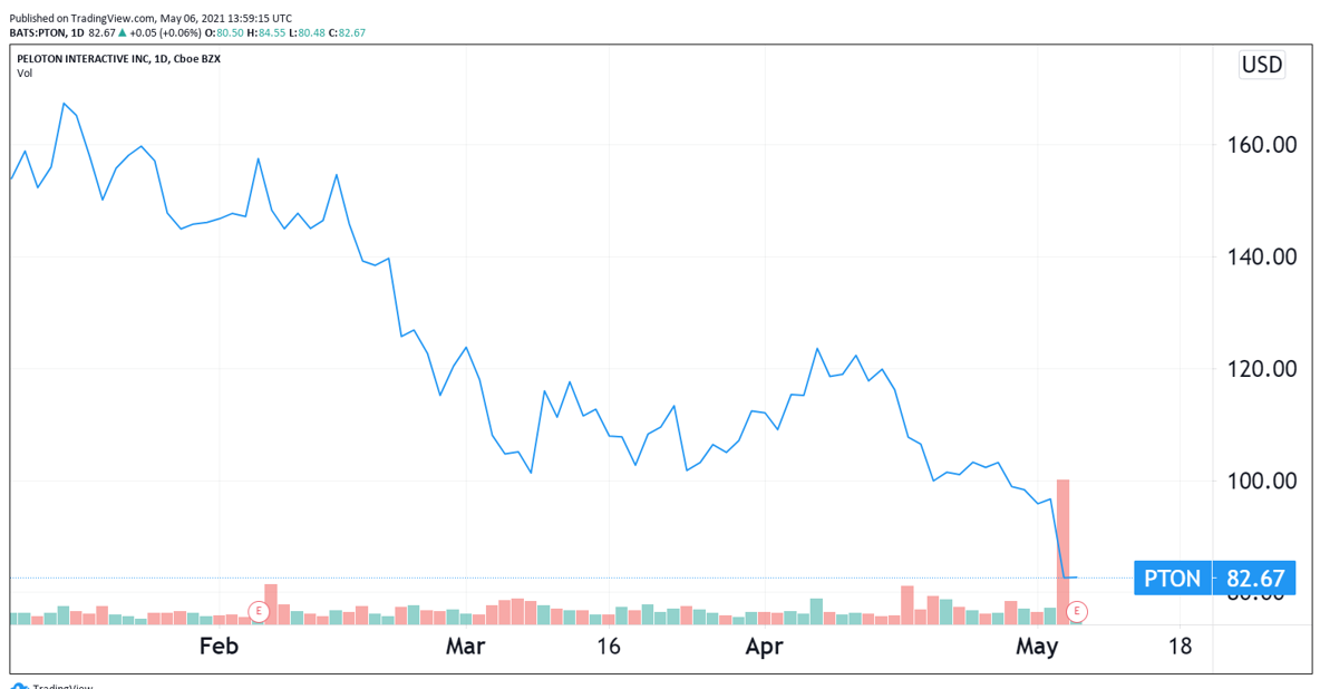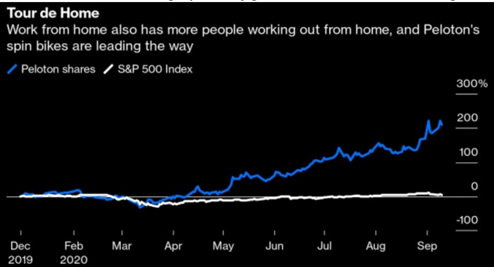 In contrast to the last graph, this figure shows Peloton’s 2020 surge.