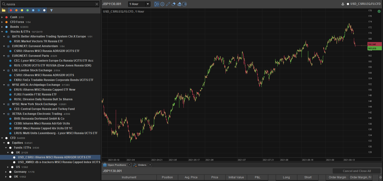 It’s tricky for investors outside of Russia to invest directly into Russian stocks. There are a host of ETFs representing various baskets of Russian stocks available when investing with FlowBank. There is the choice to go both long or short. The most popular is the MSCI Russia ADR, available as an ETF or CFD.